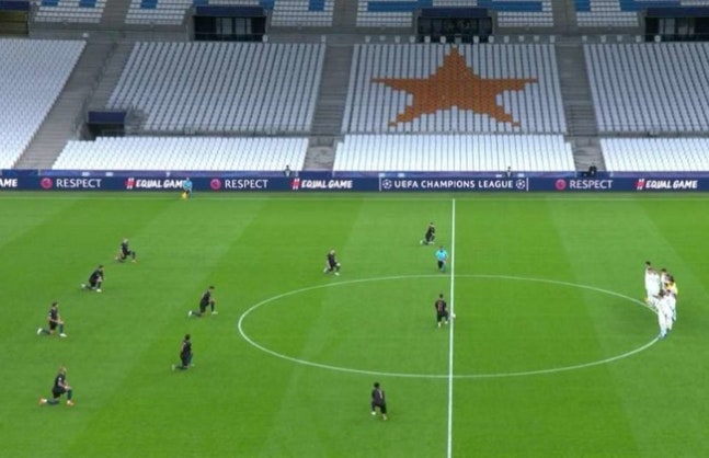 이날 경기 시작 전에 눈에 띄는 장면이 포착됐다. 킥오프 하기 직전 주심의 휘슬 소리에 맞춰 맨시티 선수들은 무릎을 꿇으며 인종차별 반대 캠페인의 일종인 무릎 꿇기 의식을 펼쳤다. 하지만 마르세유 선수들은 의식이 진행되는 동안 나란히 서있었다.