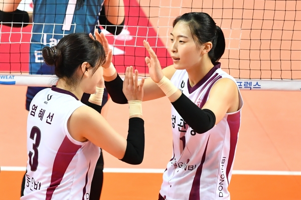 지민경(오른쪽)이 염혜선과 하이파이브를 하고 있다. (C)KOVO