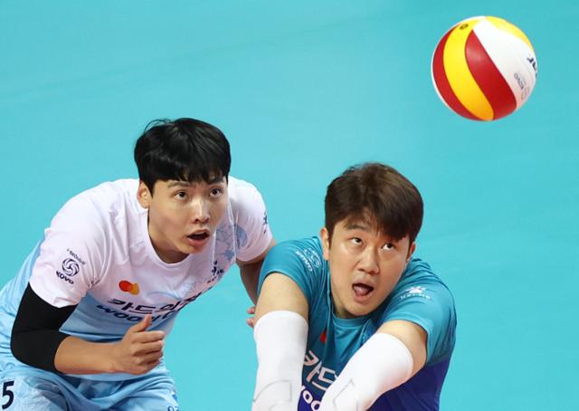 나경복(오른쪽)이 지난달 23일 서울 장충체육관에서 열린 KB손해보험과 경기에서 수비를 하고 있다. 연합뉴스.