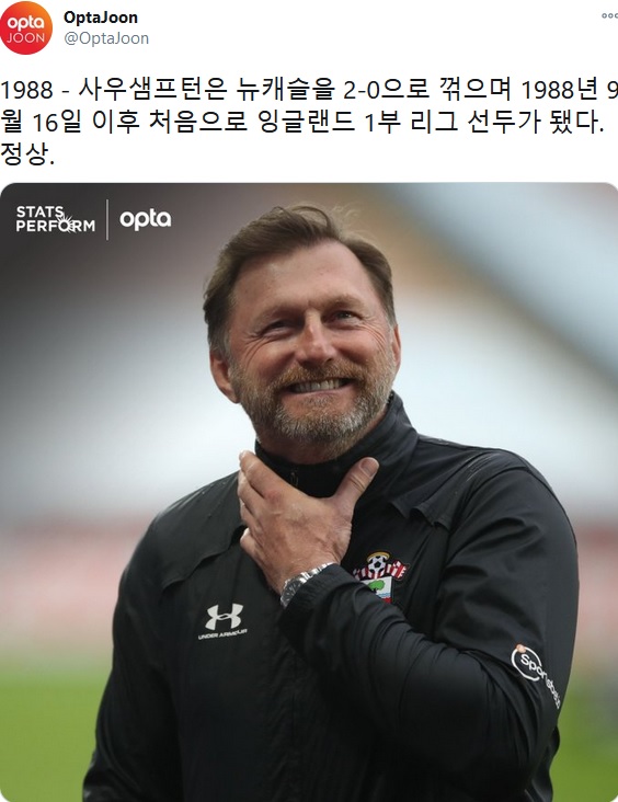 참고로 사우샘프턴이 아직 시즌 중간이라고 하더라도 1위에 올라선 건 구단 역사상 EPL에선 처음 있는 일이다. 사우샘프턴이 마지막으로 1부 리그에서 1위를 기록했던 건 EPL 시대 이전(EPL은 1992/93 시즌부터 시작됐다)이었던 1988년 9월 16일까지 거슬러 올라가야 한다(1988/89 시즌 3라운드까지 3전 전승으로 1위를 달리고 있었다). 무려 32년 만에 1부 리그 1위를 탈환한 사우샘프턴이다.
