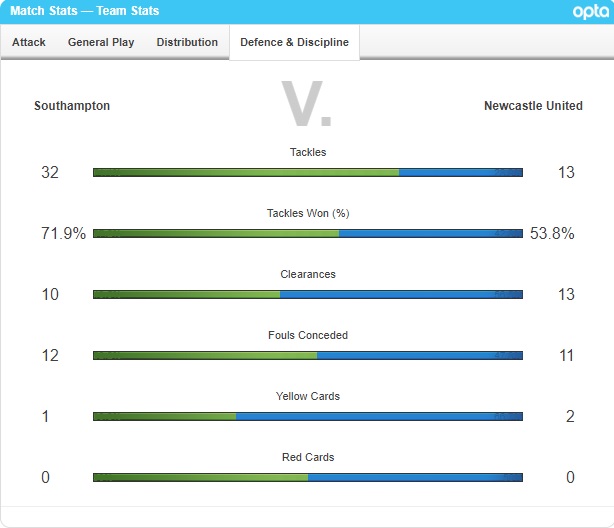 실제 사우샘프턴은 이 경기 이전까지 경기당 16.4회의 태클을 성공시켰으나 뉴캐슬전에선 무려 41회의 태클을 시도해 32회를 성공(태클 성공률 78%)시키는 괴력을 과시했다. 평소보다 2배가 더 많은 태클을 기록한 사우샘프턴이었다. 이선 공격형 미드필더 제네포가 출전 선수들 중 가장 많은 7회의 태클을 성공시켰고, 또 다른 이선 공격형 미드필더 스튜어트 암스트롱이 가장 많은 4회의 가로채기를 기록했다는 점만 보더라도 사우샘프턴이 얼마나 강한 압박을 감행했는지를 확인할 수 있다.