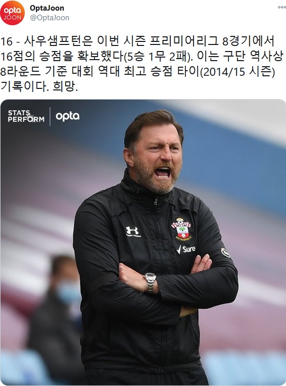 ▲ 사우샘프턴, 5승 1무 2패 승점 16점으로 8라운드 기준 구단 역대 최다 승점 타이(2014/15)