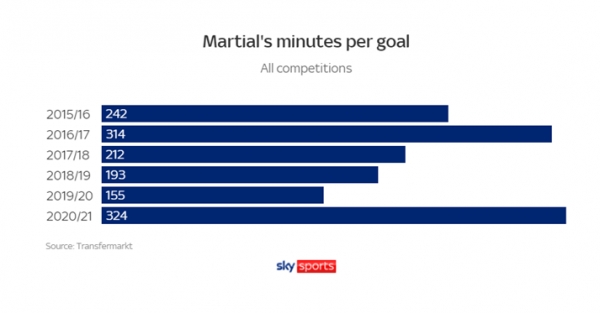 이 기록은 마샬이 맨유에 입성한 뒤 최악의 기록이기도 하다. 마샬이 갓 EPL에 입성한 2015/16시즌조차 242분 당 한 골이었다. 윙포워드로 주로 출전하던 그가 현재의 분당 득점 기록을 보여준 일이 없는데, 심각한 상황이다. 특히 직전 시즌 올레 군나르 솔샤르 감독 하에서 살아나며 155분 당 1골을 기록했던 마샬이기에 더욱 대조적이다.