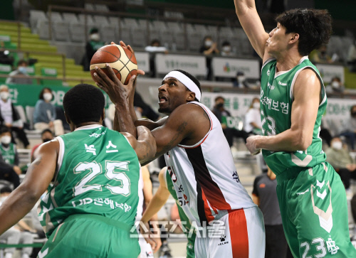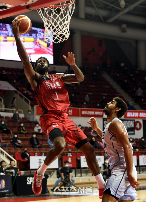 | 부산 kt 브라운이 19일 강원도 원주종합체육관에서 진행된 원주 DB와의 경기에서 골밑슛을 시도하고있다. 2020.11.19. 김도훈기자 |
