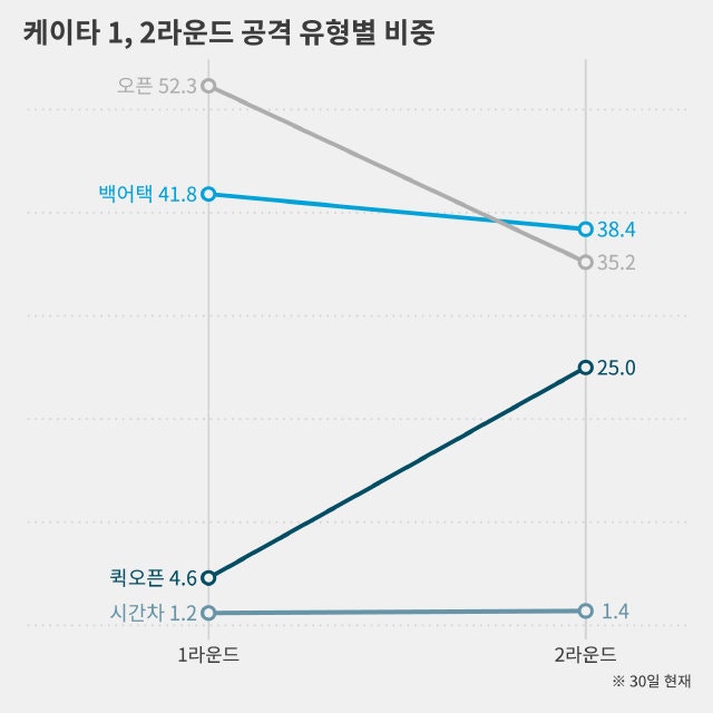 1라운드 6경기에서 케이타의 공격 유형은 ‘심플’ 그 자체였습니다. 케이타는 1라운드 때 공격을 총 409번 시도했는데 이 가운데 52.3%(214번)이 오픈이었고 41.8%(171번)이 백어택이었습니다. 전체 공격 시도 가운데 94.1%가 몰방 세트 결과물이었던 겁니다.
