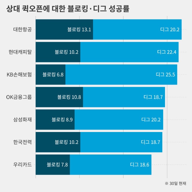 단, 수비 기록을 살펴보면 우리카드가 이 경기에서 더욱 불리한 상황이라는 점을 알 수 있습니다. 우리카드는 남자부 7개 구단 가운데 상대팀 퀵오픈에 대한 블로킹 성공률(7.8%)은 두 번째로 낮고, 디그 성공률(18.6%)은 제일 낮은 팀입니다. 블로킹과 디그 성공률을 합친 기록(26.4%) 역시 7개 구단 가운데 최하위입니다.
