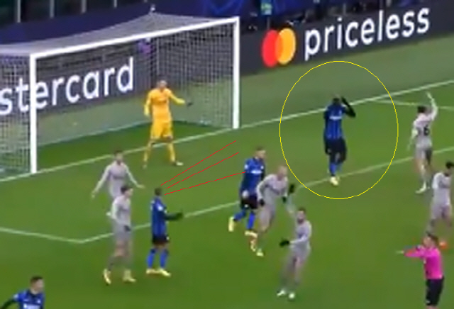 루카쿠는 9일(현지시간) 이탈리아 밀라노 쥐세페 메아짜에서 열린 샤흐타르 도네츠크와의 2020~2021시즌 유럽 챔피언스리그 B조 최종전에서 0-0 팽팽하던 후반 43분께, 코너킥 상황에서 동료 공격수 알렉시스 산체스의 헤더를 문전 앞에서 막았다. 산체스의 이마에 맞고 골문 방향으로 강하게 날아가던 공을 미처 피하지 못했다. 서있는 위치도 오프사이드였다. 설령 그의 머리에 맞고 굴절돼 골문 방향으로 향했어도 득점이 인정되지 않았을 거란 얘기. 루카쿠와 산체스는 맨유 시절부터 동료다.