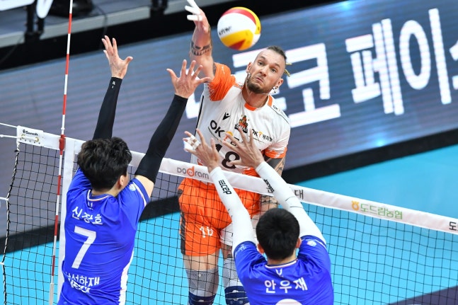 OK금융그룹 펠리페가 지난달 29일 삼성화재와의 경기에서 공격을 시도하고 있다.(KOVO 제공)© 뉴스1
