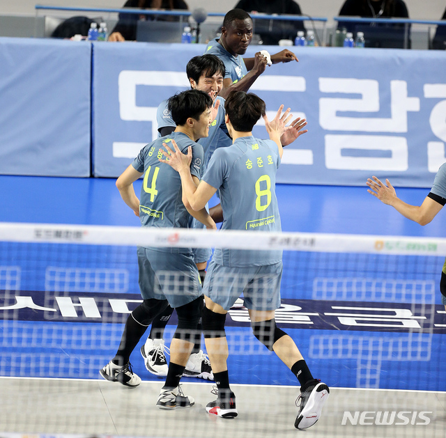 [서울=뉴시스]배훈식 기자 = 14일 천안 유관순 체육관에서 열린 도드람 V리그 현대캐피탈과 삼성화재와의 경기, 득점에 성공한 현대캐피탈 선수들이 환호하고 있다. (사진=현대캐피탈 배구단 제공) 2020.11.14.
