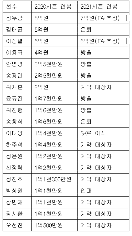 2020년 억대 연봉 선수 중 남은 선수는 10명이다.