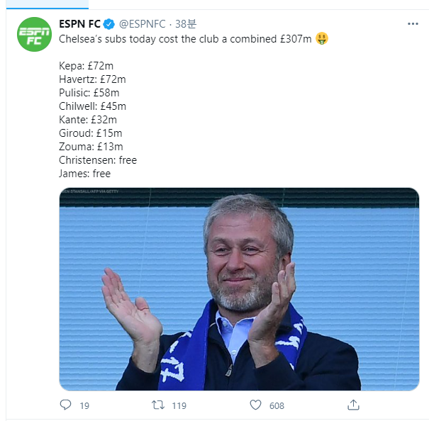 이날 첼시의 벤치를 주목할 수밖에 없었다. 글로벌 매체 ‘ESPN’은 공식 트위터를 통해 번리전 벤치에 앉았던 선수들의 몸값을 조명했다.