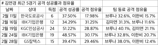최근 5경기 김연경의 공격 점유율은 17.98%-31.25%-28.87%-30.17%-29.46%다. 단 1경기만 시즌 평균을 넘었을 뿐, 4경기에서는 시즌 평균 이하로 공격을 시도했다. 지난 16일 기업은행전을 제외하면 브루나가 매 경기 팀내 가장 많은 공격을 시도하고 있다.