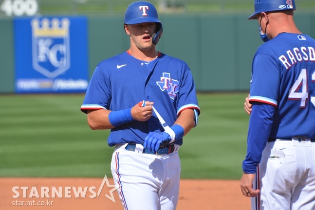텍사스 3루 유망주 조쉬 영(왼쪽)이 8일(한국시간) LA 다저스와 시범경기에서 안타를 치고 1루에 진루한 뒤 주루코치와 이야기를 나누고 있다. /서프라이즈(미국 애리조나주)=이상희 통신원
