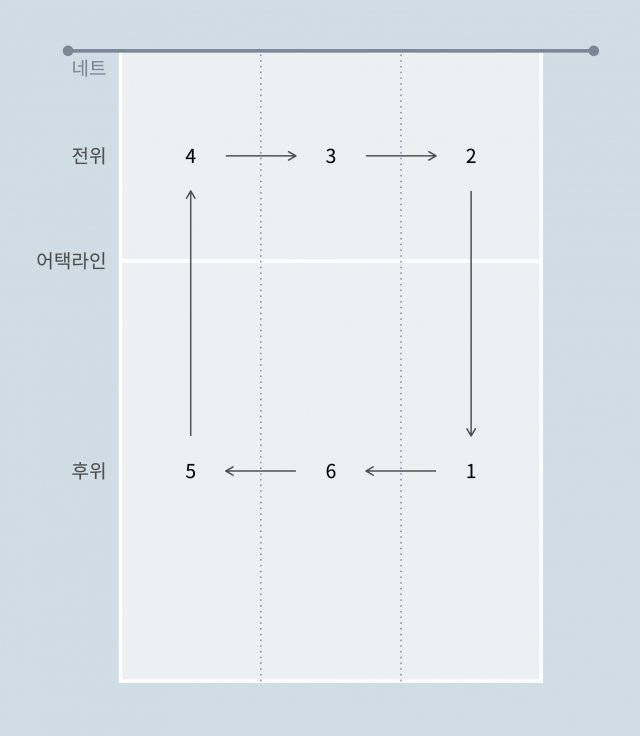 이를 ‘로테이션’(rotation)이라고 하고 2~4번 자리에 위치한 선수를 전위(前位), 나머지를 후위(後位) 선수라고 부릅니다.