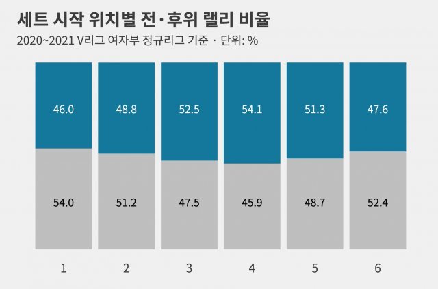 이런 자리는 4번입니다. 실제로 이번 시즌 여자부 정규리그 경기 기준으로 4번 자리에서 시작한 선수는 전체 랠리 가운데 54.1%를 전위에서 소화했습니다. 반면 1번 자리에서 시작한 선수는 54%가 후위였습니다.