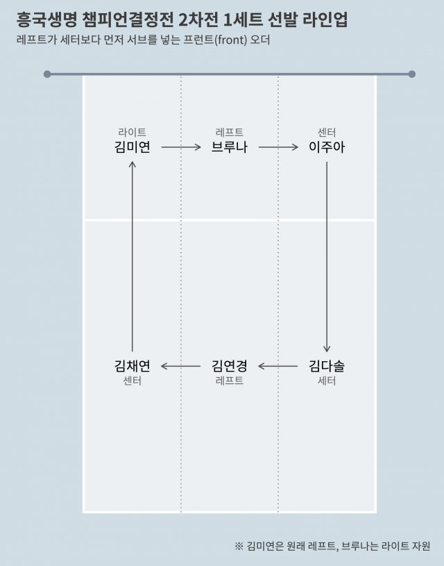 그러니까 원래 레프트 자원인 김미연을 라이트 자리에, 원래 라이트 자원인 브루나를 레프트 자리에 배치하는 ‘변칙 라인업’을 들고나온 겁니다.