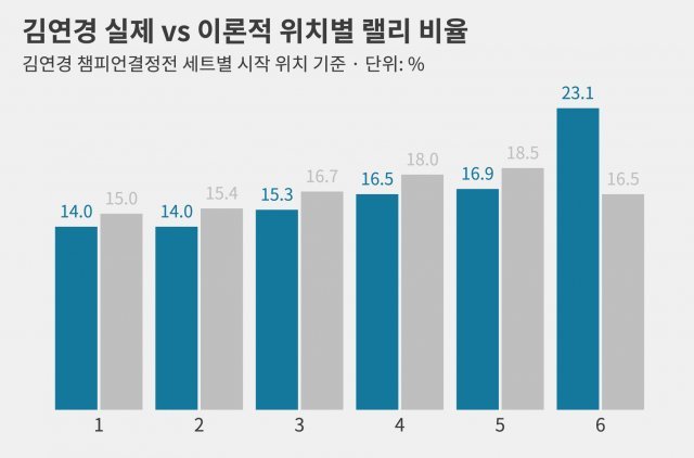 그런데 챔프전 때는 특히 6번 자리에 머문 시간이 길었습니다. 이론적으로 계산하면 김연경은 이번 챔프전 기간 전체 랠리 가운데 16.5%를 6번 자리에서 소화해야 했습니다. 실제 결과는 23.1%였습니다.