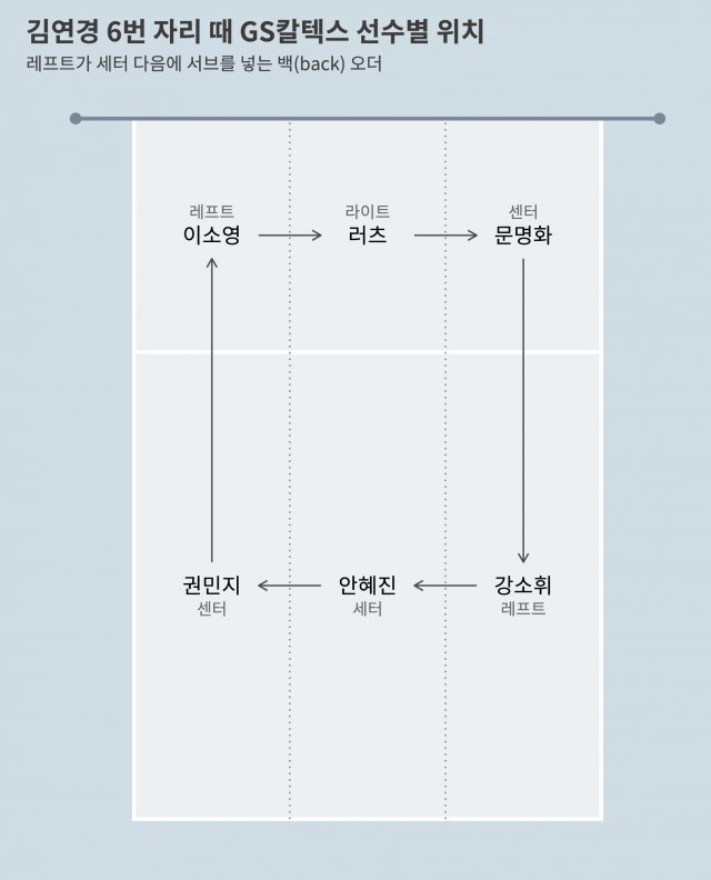 이렇게 GS칼텍스 공격이 길어지면 길어질수록 김연경은 6번 자리 그러니까 후위에 오래 묶여 있게 됩니다.