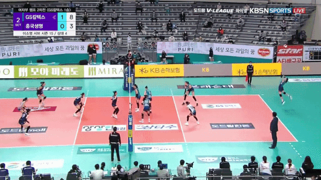 여기서 끝이 아닙니다. 강소휘 서브 때 GS칼텍스 전위에는 이소영(27) - 러츠(27) - 문명화(26)가 자리 잡게 됩니다.