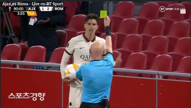 아약스 수비수 칼라피오리가 9일 유로파리그 아약스전에서 후반 막판 시간끌기를 하다 아약스 볼보이에게 공을 맞았고 이후 주심에게 경고를 받고 있다. BT스포츠 캡처