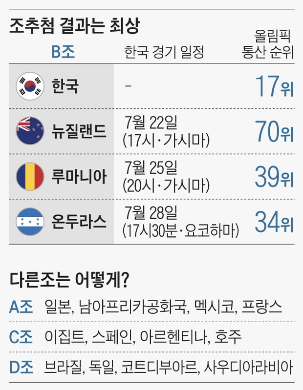 한국은 2~4포트에 속한 팀 중 프랑스, 멕시코, 이집트 등 껄끄러운 강호들을 모두 피했다. 한국은 7월 22일 오후 5시 이바라키현 가시마 스타디움에서 뉴질랜드와 조별리그 B조 첫 경기를 치른다. 3일 뒤인 25일 오후 8시 같은 장소에서 루마니아와 2차전을 벌인다. 조별리그 최종전 상대인 온두라스와는 28일 오후 5시 30분 요코하마 인터내셔널 스타디움에서 마주친다.