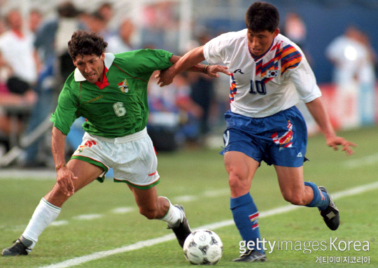 한국 축구 대표팀 측면 공격수 고정운(사진 오른쪽)이 1994년 미국 월드컵 본선 조별리그 2차전 볼리비아와의 경기에서 볼 다툼을 벌이고 있다