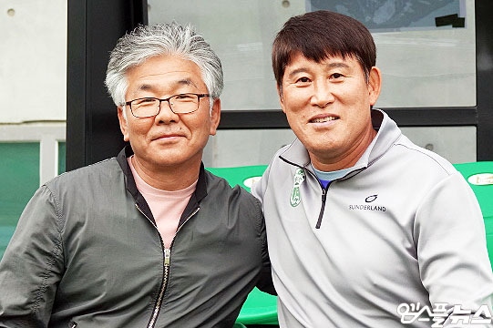김포FC 고정운 감독(사진 오른쪽)은 가장 큰 도움을 주고 있는 인물로 서영길 대표이사를 꼽았다(사진=엠스플뉴스 이근승 기자)