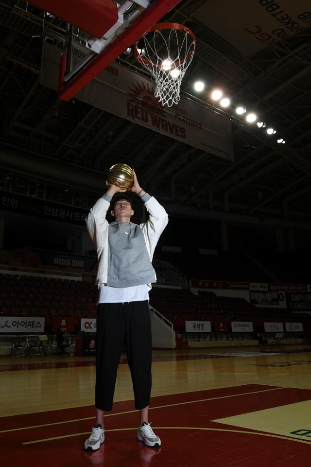 안양 KCG인삼공사 오세근이 14일 경기 안양실내체육관에서 우승 기념구로 슛 동작을 취하고 있다. 이한호 기자