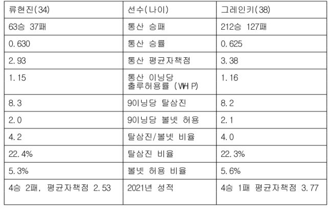'이 시대의 매덕스' 류현진과 그레인키 비교표(24일 현재)
