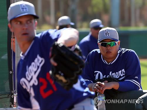 2014년 다저스 스프링캠프에서 그레인키 불펜 투구 지켜보는 류현진