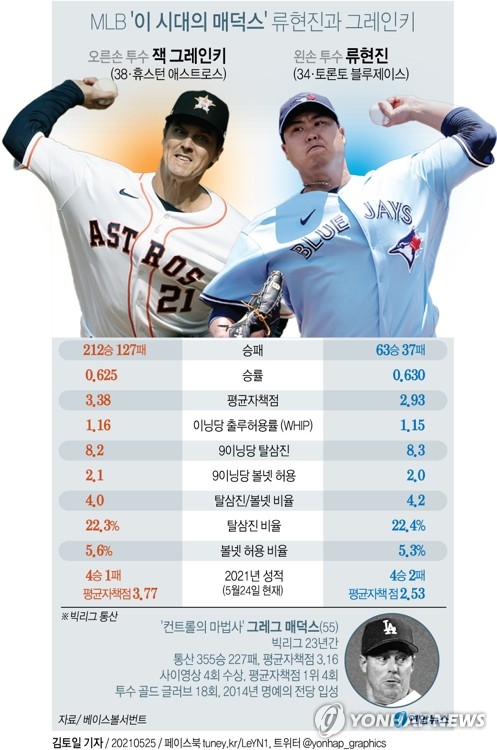 매덕스처럼 제구력 하나로 존재감을 드러내는 '이 시대의 매덕스'로는 잭 그레인키(38·휴스턴 애스트로스)와 토론토 블루제이스의 에이스 류현진(34)이 있다.