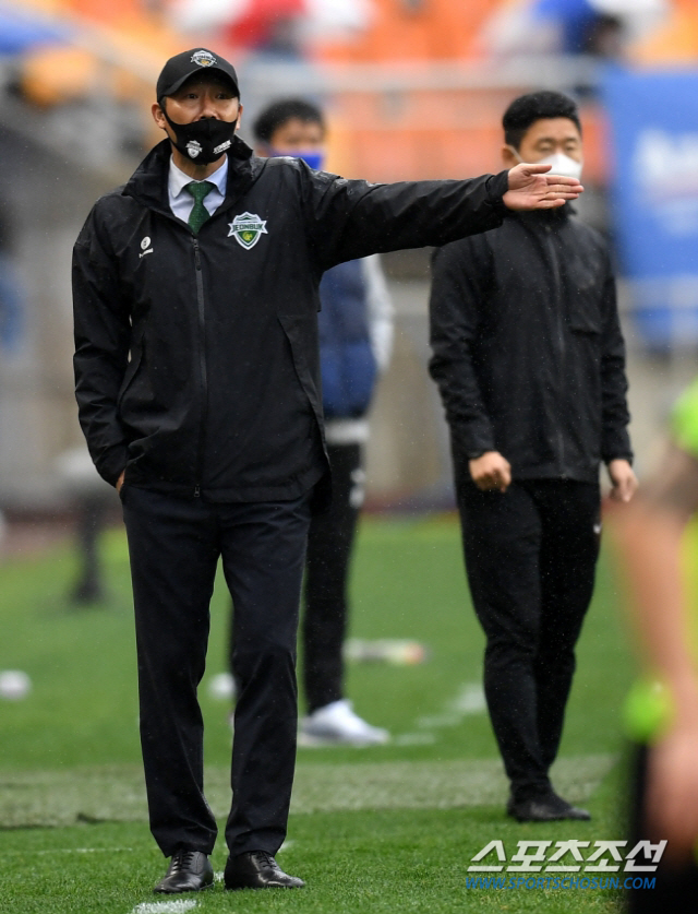 수원 삼성과 전북 현대의 K리그 1 2021 7라운드 경기가 3일 수원월드컵경기장에서 열렸다. 전북 김상식 감독이 작전지시를 하고 있다.