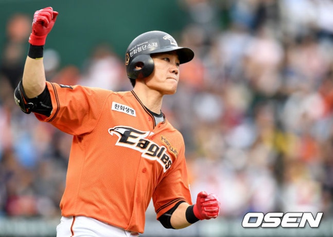 [OSEN=대전, 최규한 기자] 강경학이 역전 우월 솔로포를 치고 주먹을 불끈 쥐며 환호하고 있다.