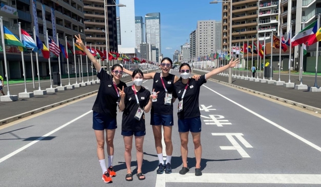 도쿄올림픽 선수촌에서 룸메이트들과. 왼쪽부터 김수지, 안혜진, 김연경, 표승주