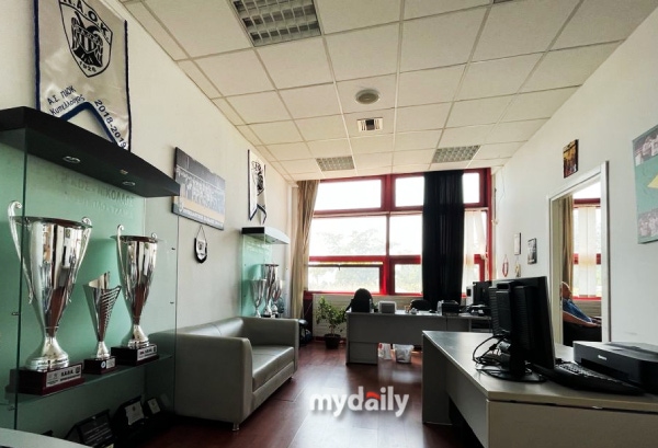 (PAOK 단장 방. 남녀 배구팀이 그간 따온 트로피들이 놓여 있다.)