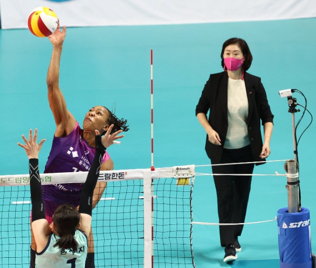 지난 16일 서울 장충체육관에서 열린 2021-2022 도드람 V-리그 여자부 개막전 GS칼텍스와 흥국생명의 경기에서 캣벨이 박미희 감독이 지켜보는 가운데 공격을 시도하는 모습. 연합뉴스