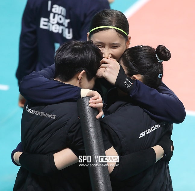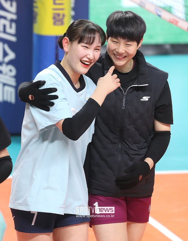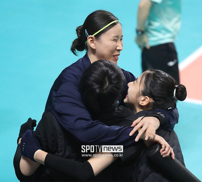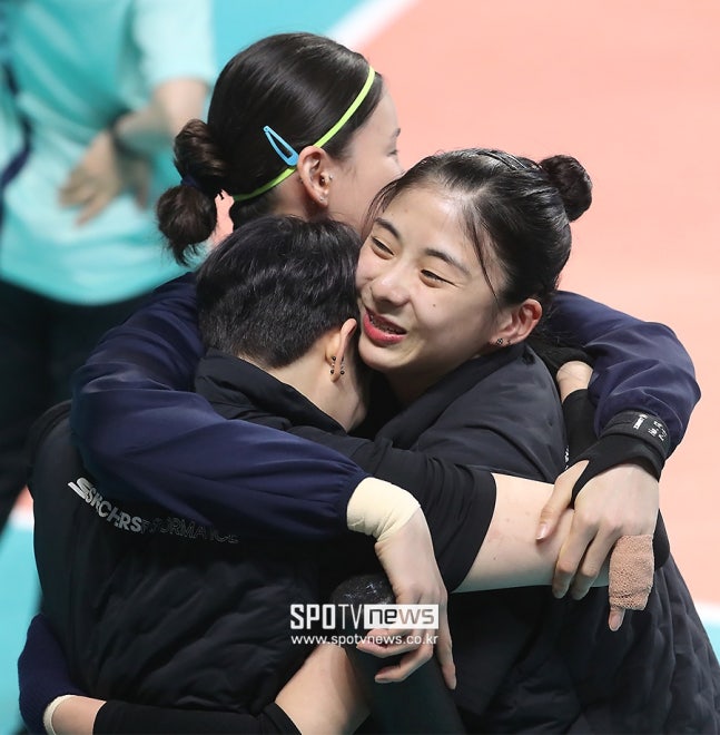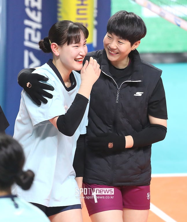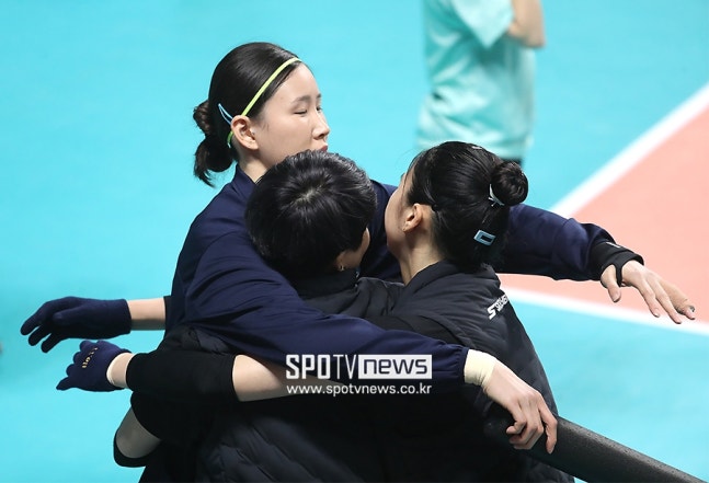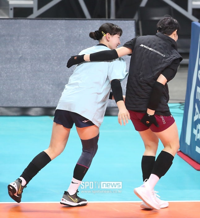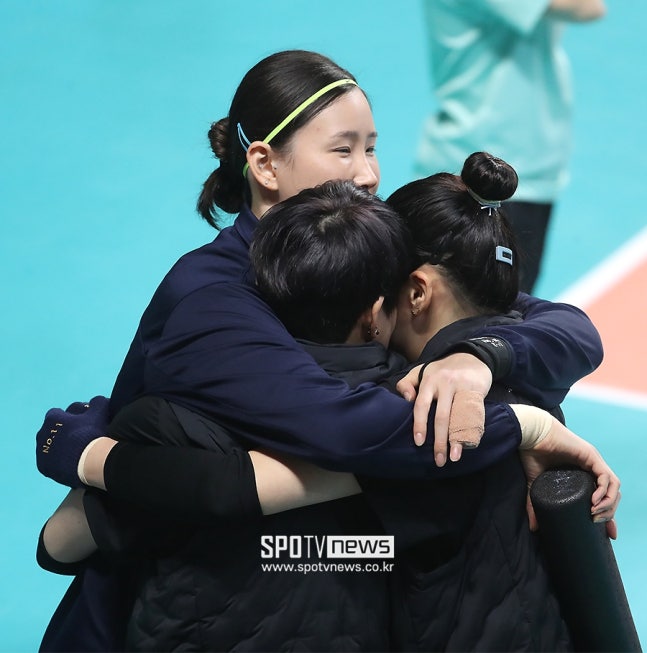 최근 뒤숭숭한 여자배구 분위기 속에서 서로를 보듬어 주는 훈훈한 장면이었다.