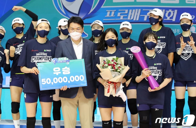 29일 경기도 의정부시 녹양동 의정부체육관에서 열린 ‘2021 의정부·도드람컵 프로배구대회(KOVO컵)' 여자부 결승전 현대건설과 GS칼텍스의 경기에서 현대건설이 3대0 승리를 거두며 2년 만에 컵대회 우승을 차지했다. 우승을 차지한 현대건설 양효진(왼쪽부터), 황연주, 황민경이 시상식 후 조원태 한국배구연맹 총재와 기념촬영을 하고 있다. 2021.8.29/뉴스1 © News1 김진환 기자
