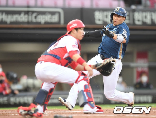 NC 나성범이 양의지의 안타 때 홈으로 달리고 있다. /OSEN DB