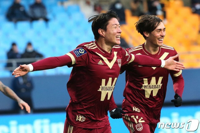 보르도의 황의조가 12일(현지시간) 프랑스 트루아의 스타드 드로브에서 열린 리그1 트루아와 경기서 시즌 6호 골인 결승골을 터트리고 기뻐하고 있다. © AFP=뉴스1 © News1 우동명 기자