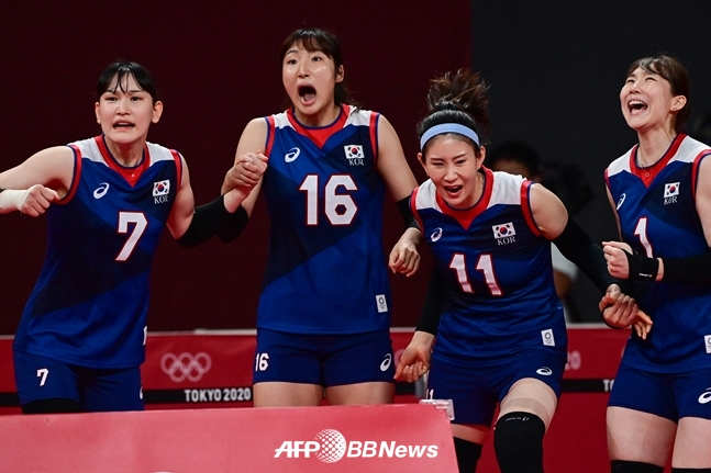 정지윤(왼쪽에서 두 번째)이 2020 도쿄올림픽 8강전 승리 후 기뻐하고 있다./AFPBBNews=뉴스1