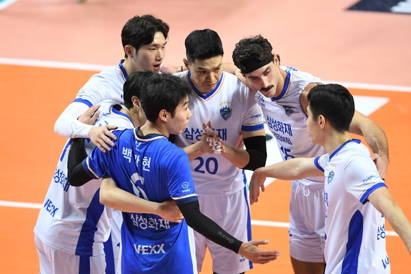 사진= 승점을 따고 기뻐하는 삼성화재, KOVO 제공