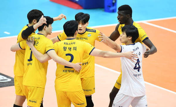 사진= 승점을 따고 기뻐하는 KB손해보험, KOVO제공