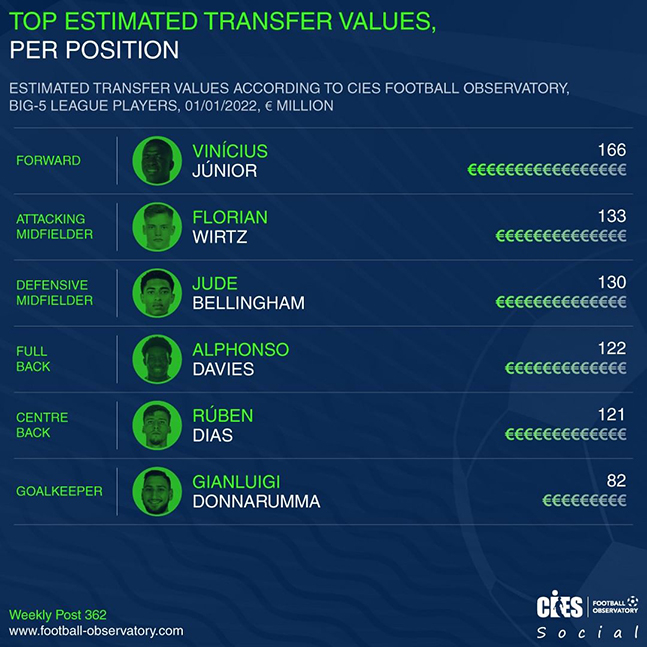 2022년 1월 1일 기준 포지션별 시장가치 1위에 오른 비니시우스(공격수·위부터), 플로리안 비르츠(공격형 미드필더), 주드 벨링엄(수비형 미드필더), 알폰소 데이비스(풀백), 루벤 디아스(센터백), 잔루이지 돈나룸마(골키퍼). /사진=CIES SNS 캡처