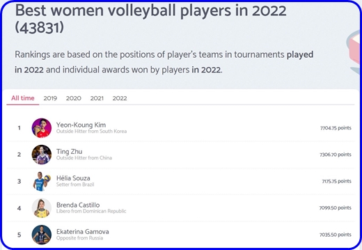 여자배구 선수들의 랭킹을 매기는 볼리박스는 각국에서 뛰고 있는 여자배구 선수들의 랭킹을 최근 업데이트했다.