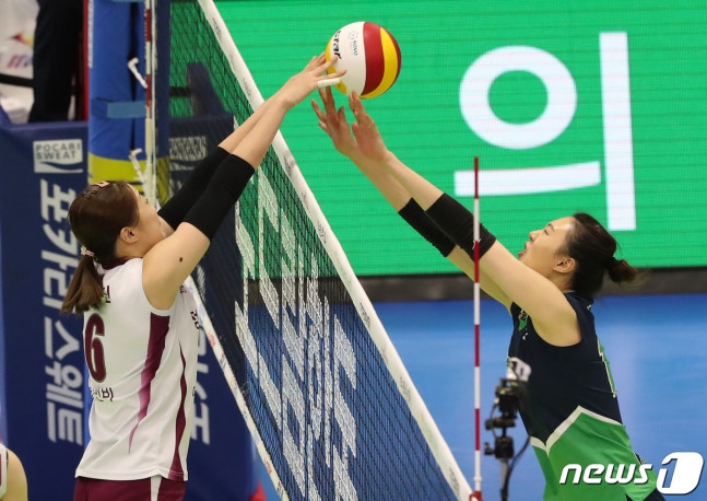 4일 오후 경기도 수원시 장안구 수원실내체육관에서 열린 프로배구 '2021-22시즌 도드람 V리그' 여자부 현대건설과 KGC인삼공사의 경기에서 양팀 선수들이 공격과 수비를 하고 있다. 2022.1.4/뉴스1 © News1 김영운 기자