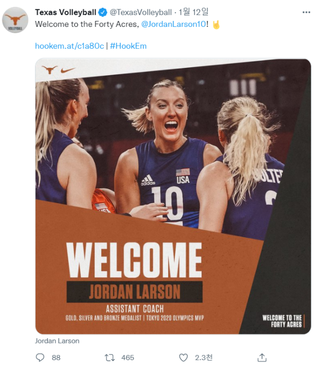 미국 텍사스대학교 배구팀은 지난 12일 “2020 도쿄올림픽 우승 멤버인 조던 라슨이 텍사스 배구팀의 어시스턴트 코치로 합류한다”고 밝혔다.