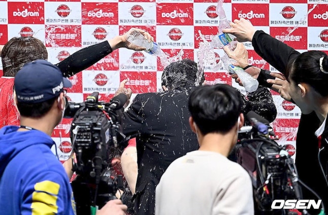 [OSEN=광주, 이대선 기자]경기 종료 후 페퍼저축은행 김형실 감독이 선수들에게 축하 물세례를 받고 닦아내고 있다.