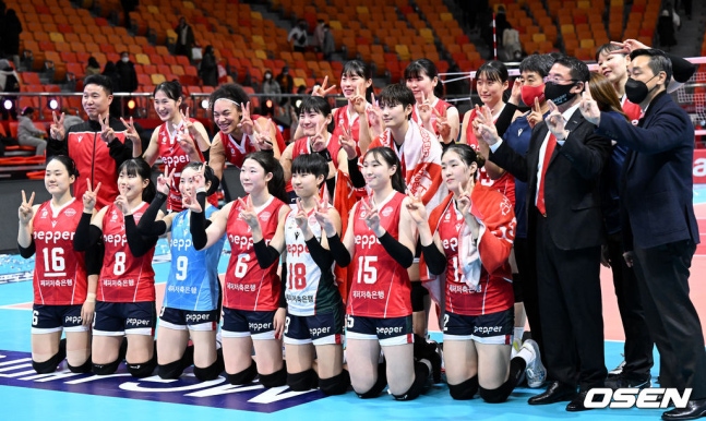 [OSEN=광주, 이대선 기자] 페퍼저축은행이 지긋지긋한 17연패를 끊었다. 창단 첫 셧아웃 승리로 70일 만에 환호했다. 페퍼저축은행은 18일 광주 페퍼스타디움에서 열린 도드람 2021~2022 V-리그 여자부 4라운드 경기에서 IBK기업은행을 세트 스코어 3-0(25-18 25-22 25-21) 셧아웃으로 제압했다. 광주 홈에서 12경기 만에 첫 승을 신고한 페퍼저축은행은 지난해 11월13일 현대건설전부터 이어진 17연패 늪에서 벗어났다. 지난해 11월9일 IBK기업은행전에서 창단 첫 승을 거둔 뒤 70일 만에 웃었다. 시즌 2승 모두 IBK기업은행 상대. 시즌 2승22패 승점 8점이 된 7위 페퍼저축은행은 6위 IBK기업은행(4승18패 승점11)과 격차를 3점 차이로 좁혔다.경기 종료 후 페퍼저축은행 김형실 감독이 선수들과 기념촬영을 하고 있다.
