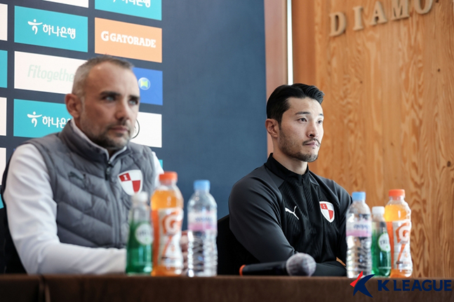 18일 부산송정호텔에서 진행된 K리그 미디어 캠프 기자회견에 참석한 부산아이파크 히카르두 페레즈(왼쪽) 감독과 박종우. /사진=한국프로축구연맹